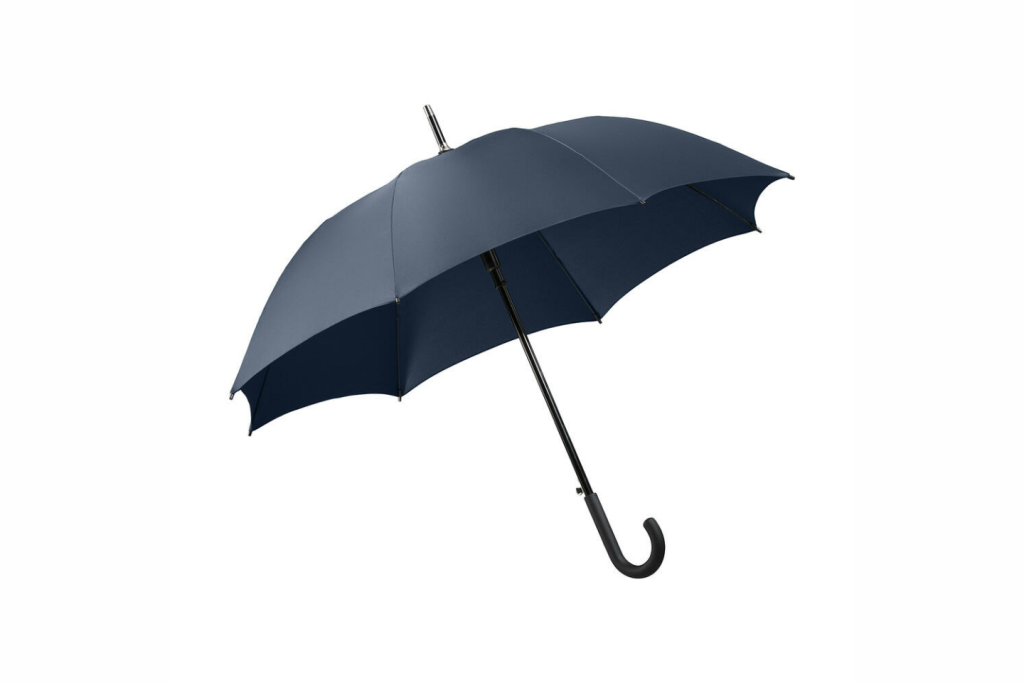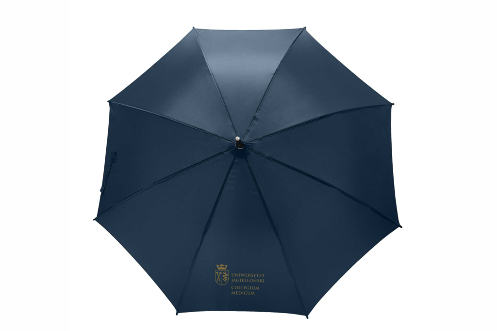 Parasol w kolorze eleganckiego ciemnego granatu ze złotym logo.